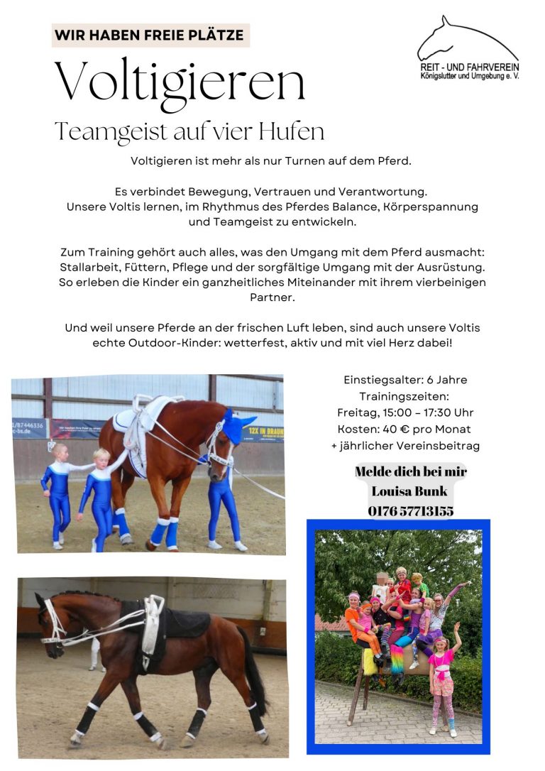 Seit 2022 bin ich nun beim RFV Königslutter als Trainer fürs Voltigieren tätig und unterrichte ein Team auf meinen beiden Hannoveranern Win und Giddy, kurz Team „Widdy“. Meine Voltis sind zwischen vier und dreizehn Jahren alt. Auch wenn es sich um eine E-Gruppe handelt, sind wir bereits seit dem Sommer 2023 auf Turnieren unterwegs und das erfolgreich.